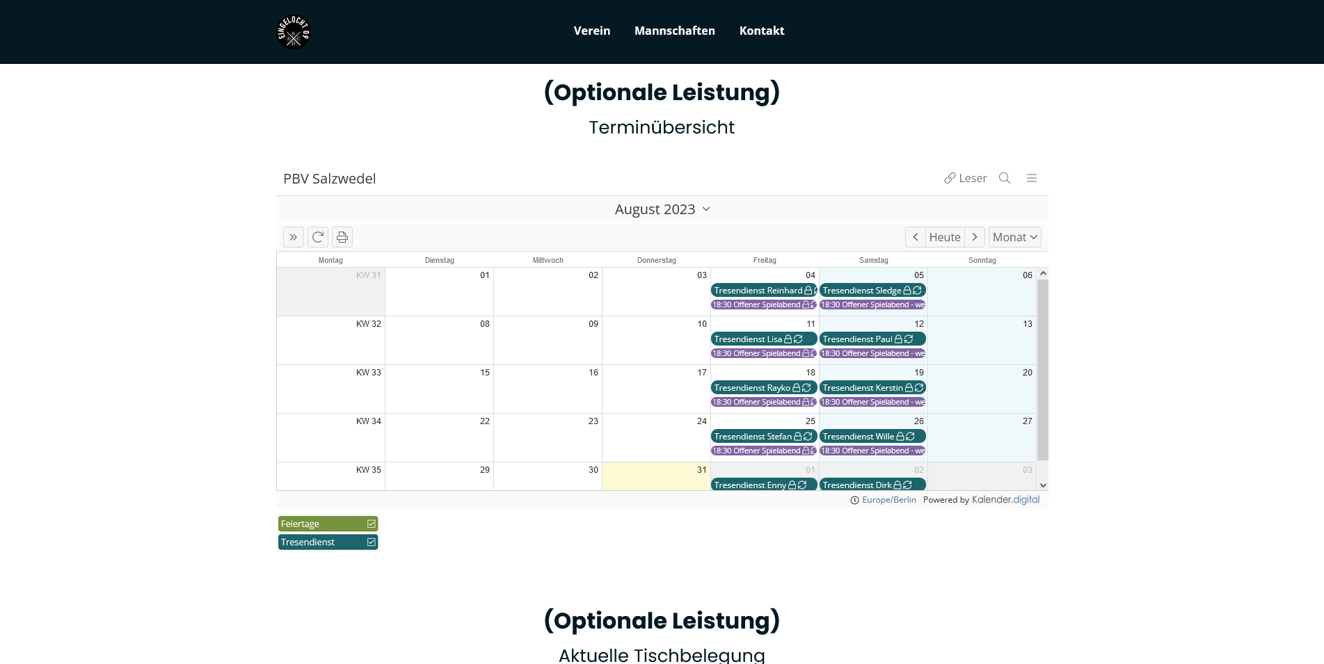Bietet Euren Vereinsmitgliedern und Billard-Interessierten eine Übersicht über anstehende Spiele und Veranstaltungen Eures Vereins an. Wir binden dieses Tool vorab in Eure Website und erstellen den ersten Admin-Zugang. Im Anschluss könnt auch Ihr ganz leicht euren Kalender bearbeiten und anhand von verschiedenen Links mit diversen Berechtigungen an Eure Vereinsmitglieder verteilen.